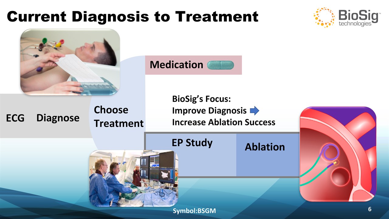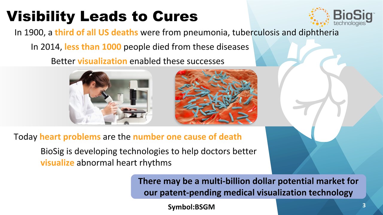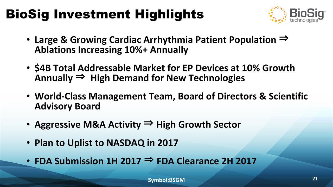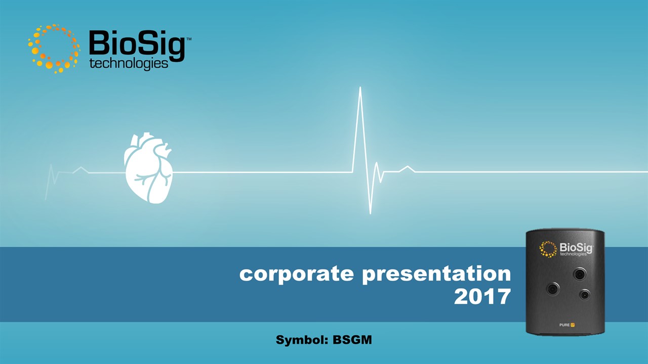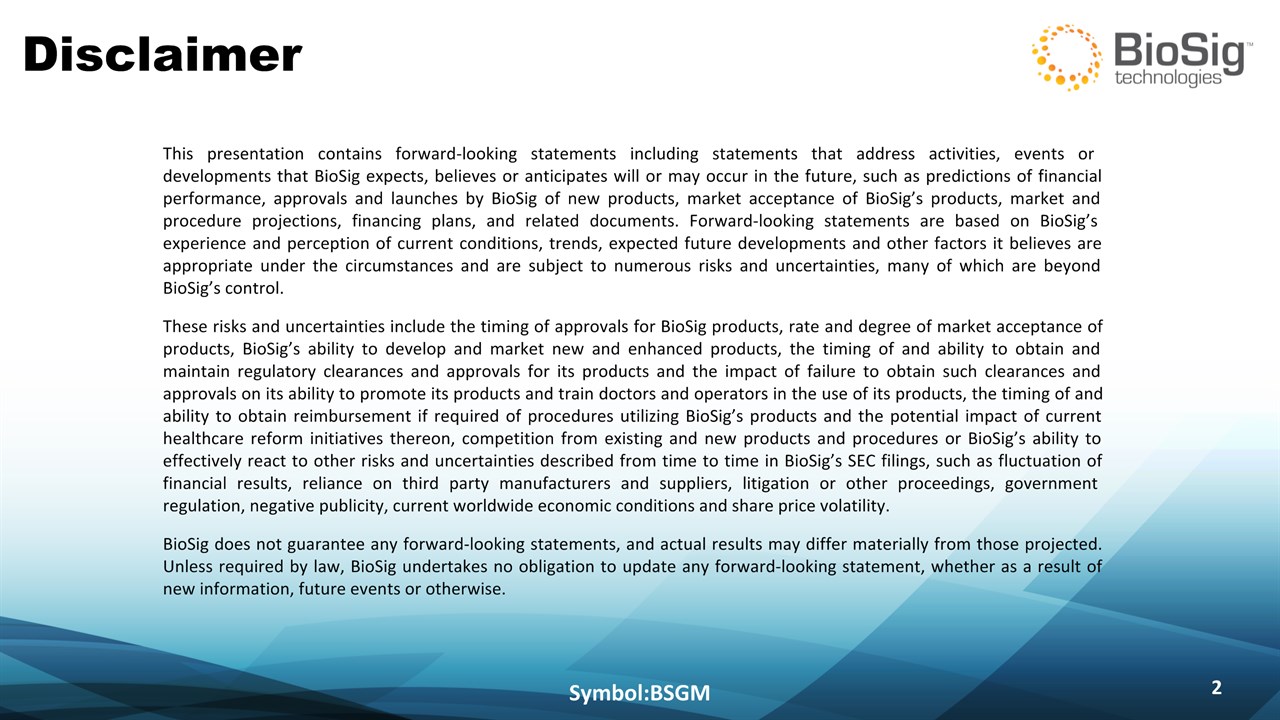 Disclaimer Symbol:BSGM * This presentation contains forward-looking statements including statements that address activities, events or developments that BioSig expects, believes or anticipates will or may occur in the future, such as predictions of financial performance, approvals and launches by BioSig of new products, market acceptance of BioSig’s products, market and procedure projections, financing plans, and related documents. Forward-looking statements are based on BioSig’s experience and perception of current conditions, trends, expected future developments and other factors it believes are appropriate under the circumstances and are subject to numerous risks and uncertainties, many of which are beyond BioSig’s control. These risks and uncertainties include the timing of approvals for BioSig products, rate and degree of market acceptance of products, BioSig’s ability to develop and market new and enhanced products, the timing of and ability to obtain and maintain regulatory clearances and approvals for its products and the impact of failure to obtain such clearances and approvals on its ability to promote its products and train doctors and operators in the use of its products, the timing of and ability to obtain reimbursement if required of procedures utilizing BioSig’s products and the potential impact of current healthcare reform initiatives thereon, competition from existing and new products and procedures or BioSig’s ability to effectively react to other risks and uncertainties described from time to time in BioSig’s SEC filings, such as fluctuation of financial results, reliance on third party manufacturers and suppliers, litigation or other proceedings, government regulation, negative publicity, current worldwide economic conditions and share price volatility. BioSig does not guarantee any forward-looking statements, and actual results may differ materially from those projected. Unless required by law, BioSig undertakes no obligation to update any forward-looking statement, whether as a result of new information, future events or otherwise.