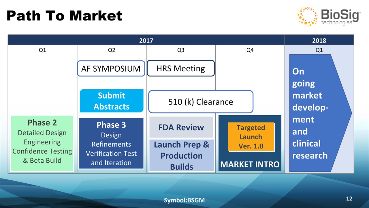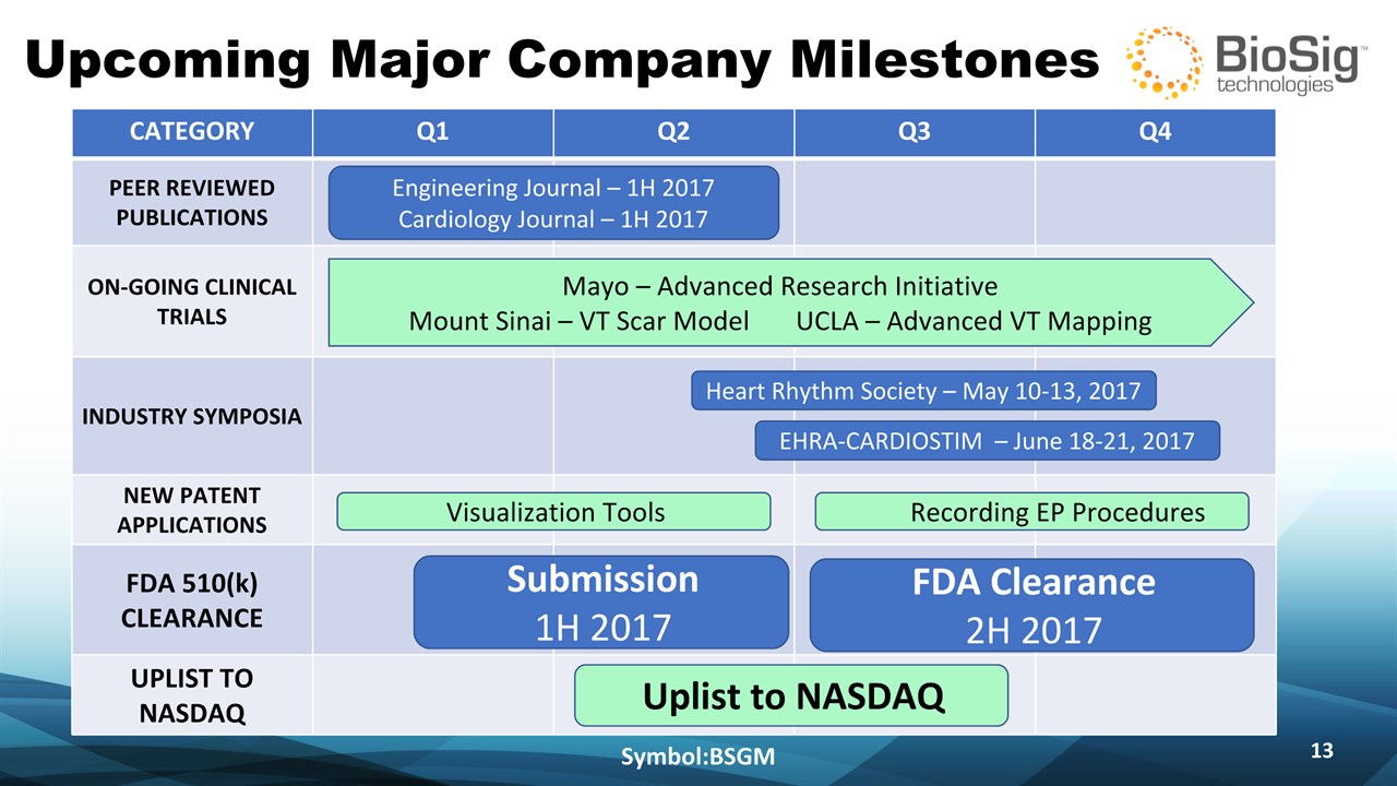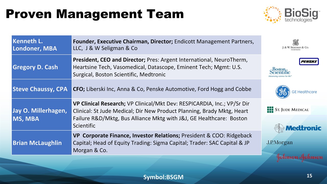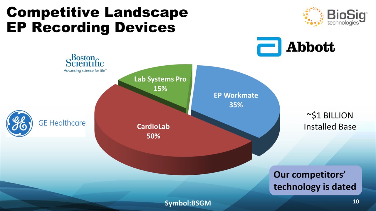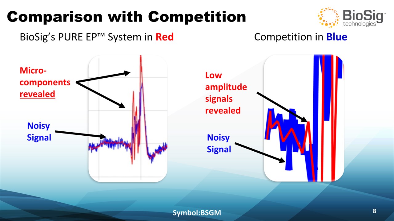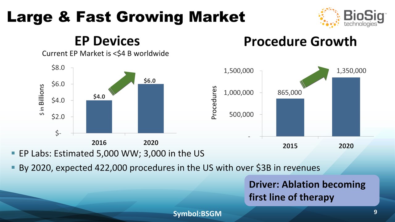 Disclaimer Symbol:BSGM * This presentation contains forward-looking statements including statements that address activities, events or developments that BioSig expects, believes or anticipates will or may occur in the future, such as predictions of financial performance, approvals and launches by BioSig of new products, market acceptance of BioSig’s products, market and procedure projections, financing plans, and related documents. Forward-looking statements are based on BioSig’s experience and perception of current conditions, trends, expected future developments and other factors it believes are appropriate under the circumstances and are subject to numerous risks and uncertainties, many of which are beyond BioSig’s control. These risks and uncertainties include the timing of approvals for BioSig products, rate and degree of market acceptance of products, BioSig’s ability to develop and market new and enhanced products, the timing of and ability to obtain and maintain regulatory clearances and approvals for its products and the impact of failure to obtain such clearances and approvals on its ability to promote its products and train doctors and operators in the use of its products, the timing of and ability to obtain reimbursement if required of procedures utilizing BioSig’s products and the potential impact of current healthcare reform initiatives thereon, competition from existing and new products and procedures or BioSig’s ability to effectively react to other risks and uncertainties described from time to time in BioSig’s SEC filings, such as fluctuation of financial results, reliance on third party manufacturers and suppliers, litigation or other proceedings, government regulation, negative publicity, current worldwide economic conditions and share price volatility. BioSig does not guarantee any forward-looking statements, and actual results may differ materially from those projected. Unless required by law, BioSig undertakes no obligation to update any forward-looking statement, whether as a result of new information, future events or otherwise.