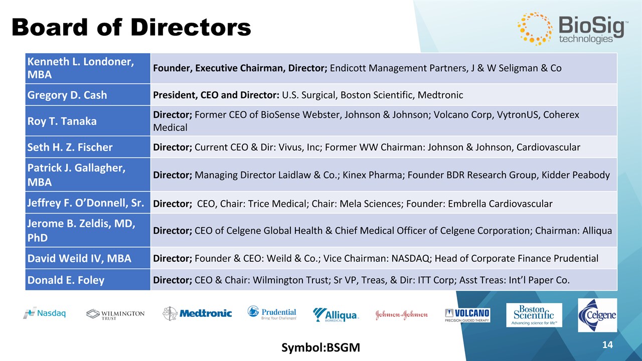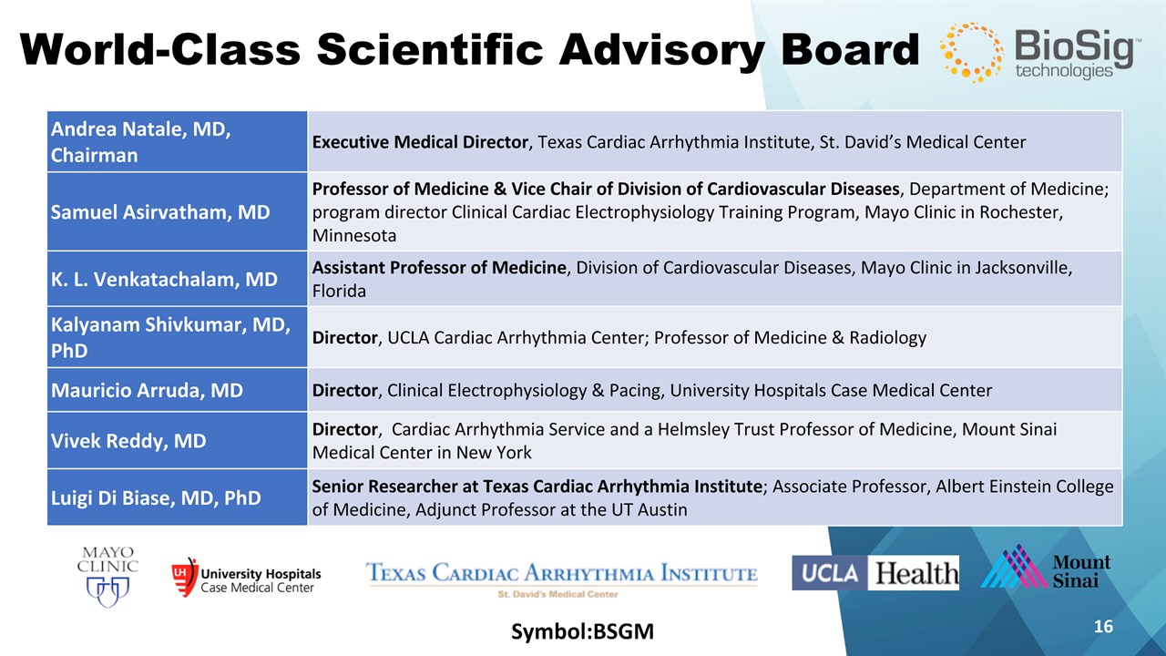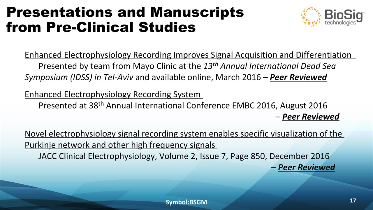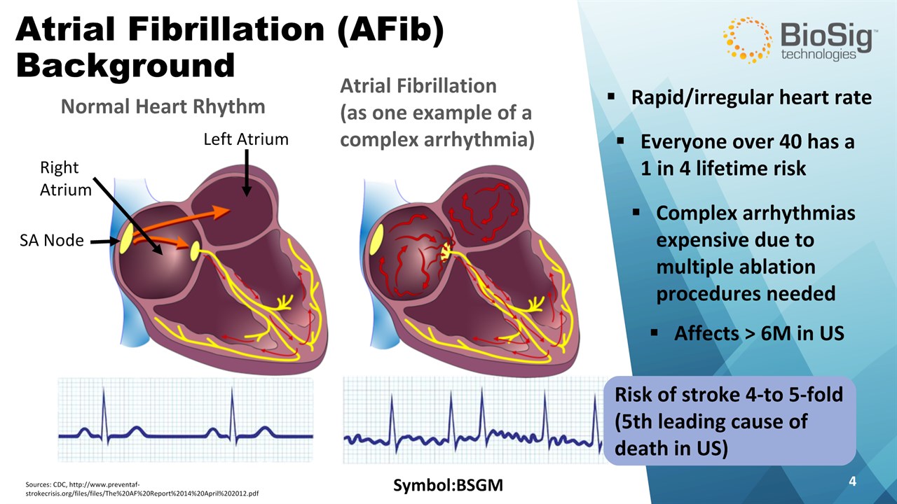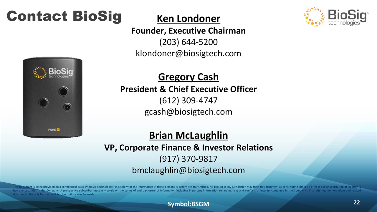 Disclaimer Symbol:BSGM * This presentation contains forward-looking statements including statements that address activities, events or developments that BioSig expects, believes or anticipates will or may occur in the future, such as predictions of financial performance, approvals and launches by BioSig of new products, market acceptance of BioSig’s products, market and procedure projections, financing plans, and related documents. Forward-looking statements are based on BioSig’s experience and perception of current conditions, trends, expected future developments and other factors it believes are appropriate under the circumstances and are subject to numerous risks and uncertainties, many of which are beyond BioSig’s control. These risks and uncertainties include the timing of approvals for BioSig products, rate and degree of market acceptance of products, BioSig’s ability to develop and market new and enhanced products, the timing of and ability to obtain and maintain regulatory clearances and approvals for its products and the impact of failure to obtain such clearances and approvals on its ability to promote its products and train doctors and operators in the use of its products, the timing of and ability to obtain reimbursement if required of procedures utilizing BioSig’s products and the potential impact of current healthcare reform initiatives thereon, competition from existing and new products and procedures or BioSig’s ability to effectively react to other risks and uncertainties described from time to time in BioSig’s SEC filings, such as fluctuation of financial results, reliance on third party manufacturers and suppliers, litigation or other proceedings, government regulation, negative publicity, current worldwide economic conditions and share price volatility. BioSig does not guarantee any forward-looking statements, and actual results may differ materially from those projected. Unless required by law, BioSig undertakes no obligation to update any forward-looking statement, whether as a result of new information, future events or otherwise.