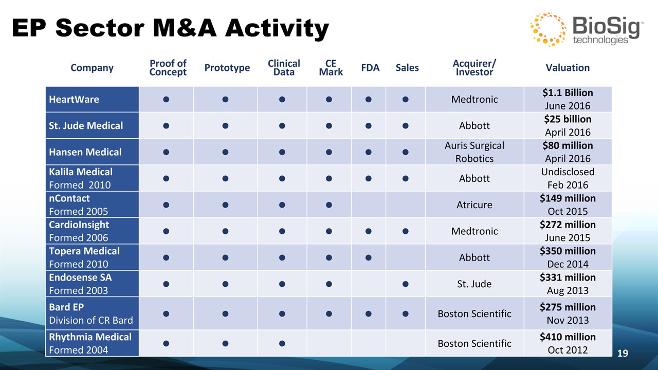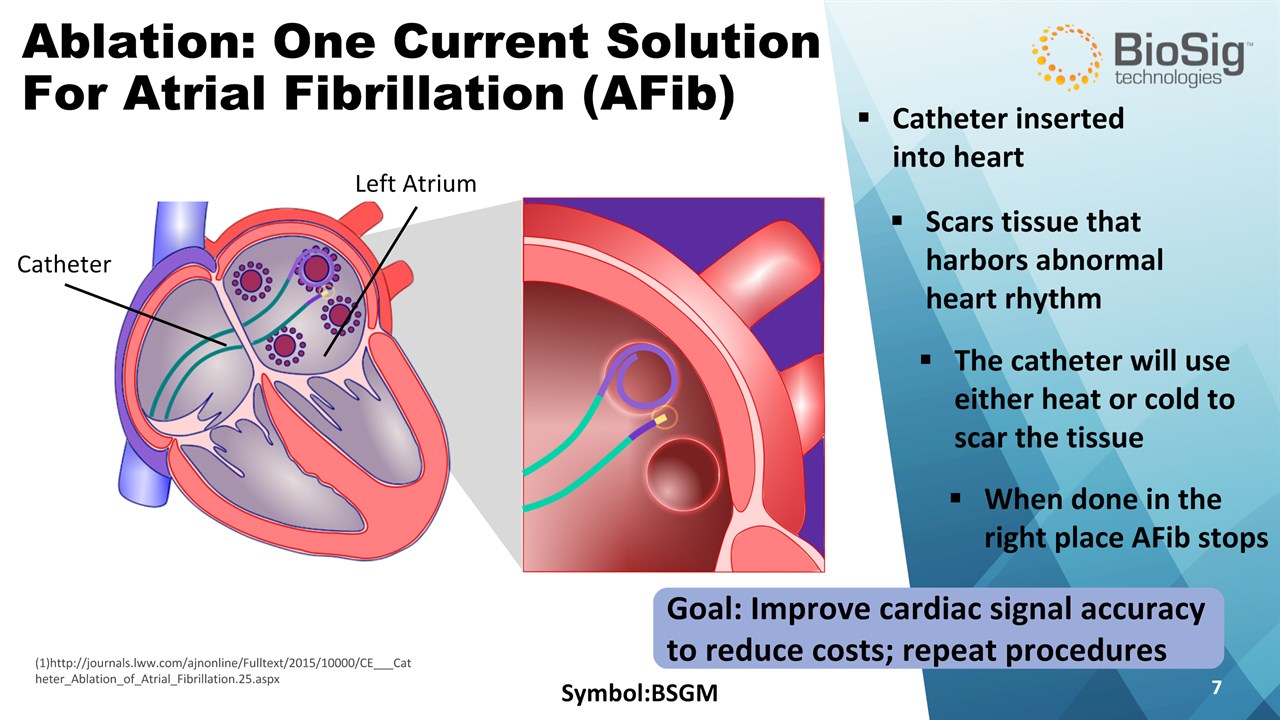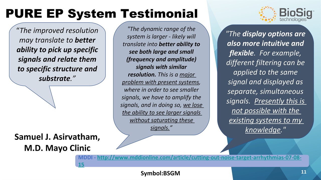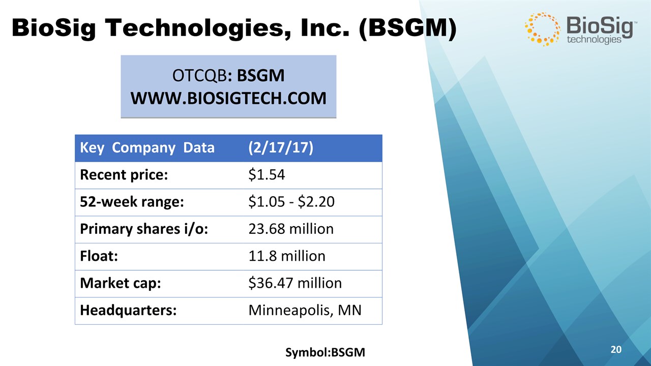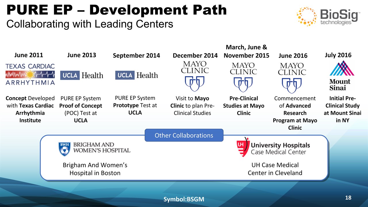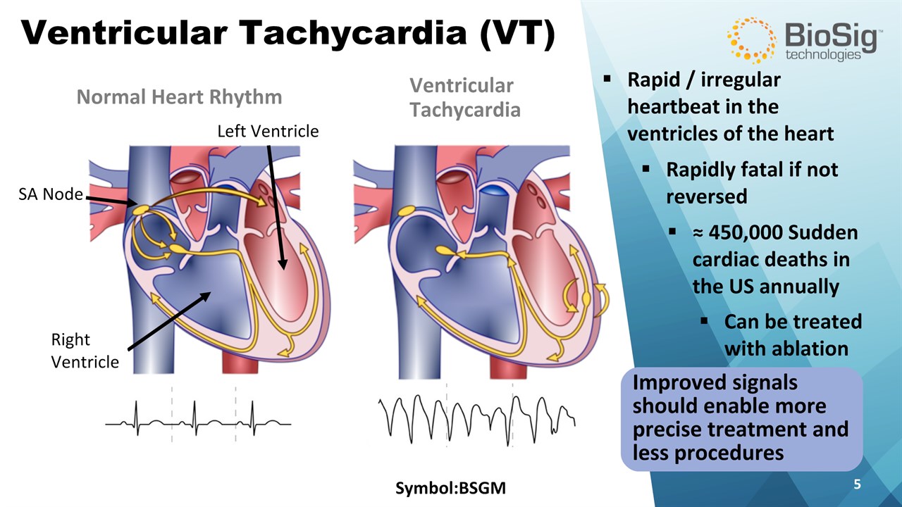 Disclaimer Symbol:BSGM * This presentation contains forward-looking statements including statements that address activities, events or developments that BioSig expects, believes or anticipates will or may occur in the future, such as predictions of financial performance, approvals and launches by BioSig of new products, market acceptance of BioSig’s products, market and procedure projections, financing plans, and related documents. Forward-looking statements are based on BioSig’s experience and perception of current conditions, trends, expected future developments and other factors it believes are appropriate under the circumstances and are subject to numerous risks and uncertainties, many of which are beyond BioSig’s control. These risks and uncertainties include the timing of approvals for BioSig products, rate and degree of market acceptance of products, BioSig’s ability to develop and market new and enhanced products, the timing of and ability to obtain and maintain regulatory clearances and approvals for its products and the impact of failure to obtain such clearances and approvals on its ability to promote its products and train doctors and operators in the use of its products, the timing of and ability to obtain reimbursement if required of procedures utilizing BioSig’s products and the potential impact of current healthcare reform initiatives thereon, competition from existing and new products and procedures or BioSig’s ability to effectively react to other risks and uncertainties described from time to time in BioSig’s SEC filings, such as fluctuation of financial results, reliance on third party manufacturers and suppliers, litigation or other proceedings, government regulation, negative publicity, current worldwide economic conditions and share price volatility. BioSig does not guarantee any forward-looking statements, and actual results may differ materially from those projected. Unless required by law, BioSig undertakes no obligation to update any forward-looking statement, whether as a result of new information, future events or otherwise.