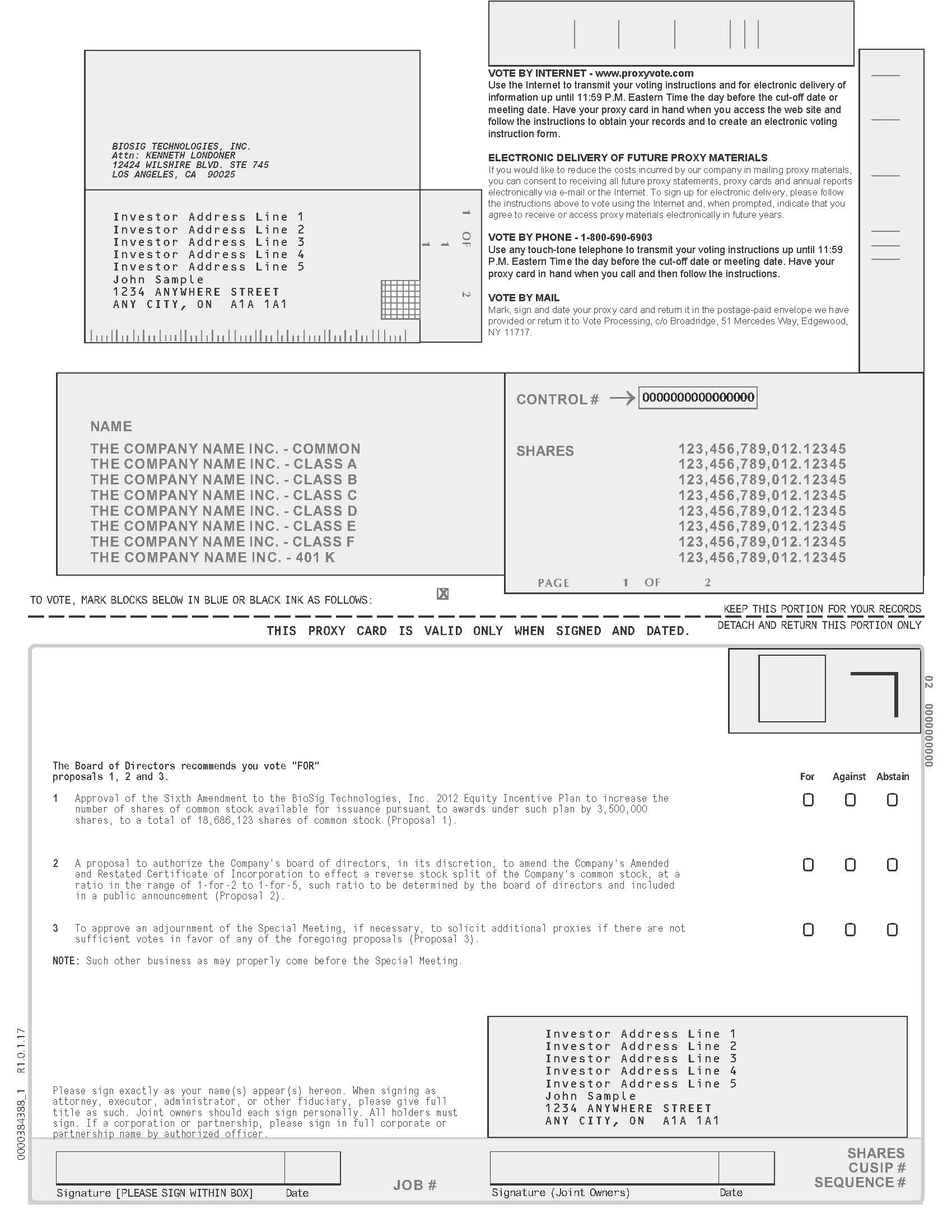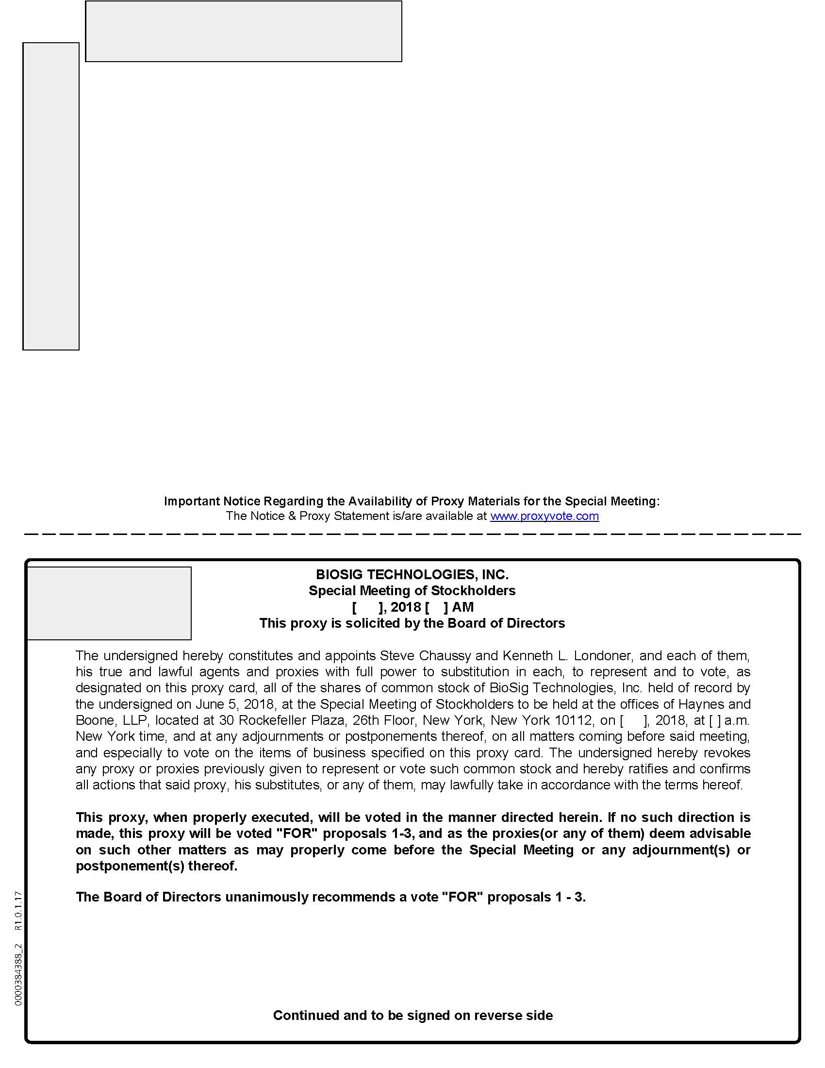 Please note that in order to gain admission to the site of our Special Meeting, all attendees will need to present a photo identification card and have their name previously provided to building security. As such, in order to facilitate your attendance at the Special Meeting, we strongly encourage you to advise Lora Mikolaitis by email at info@biosigtech.com or phone at 512-329-2643 if you plan to attend the meeting prior to 5:00 p.m., New York time, on [●], 2018 so that we can timely provide your name to building security. In the event that you do not advise us ahead of time that you will be attending the special meeting, we encourage you to arrive at the meeting no later than [●] a.m., New York time, in order to ensure that you are able to pass through security prior to the start of the meeting.
