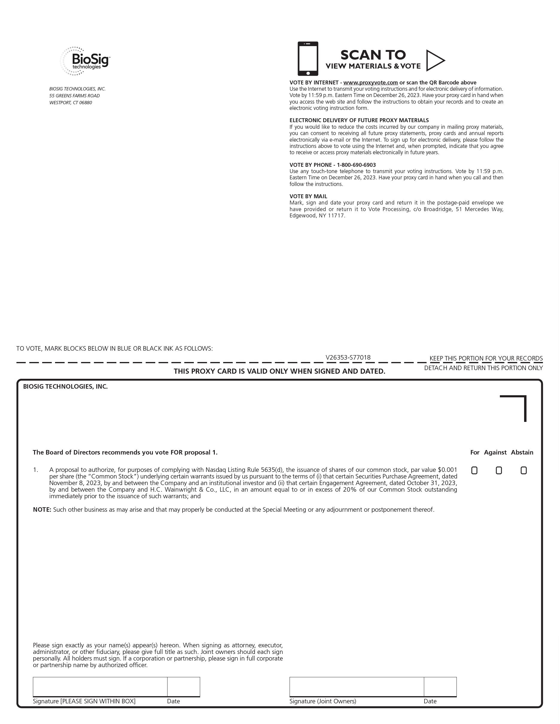 To facilitate an orderly meeting, we strongly encourage you to advise Lora Mikolaitis by email at info@biosigtech.com or phone at (203) 409-5444 ext. 117 if you plan to attend the meeting prior to 5:00 p.m., Eastern Time, on December 26, 2023, and to arrive at the meeting no later than 9:30 a.m., Eastern Time.