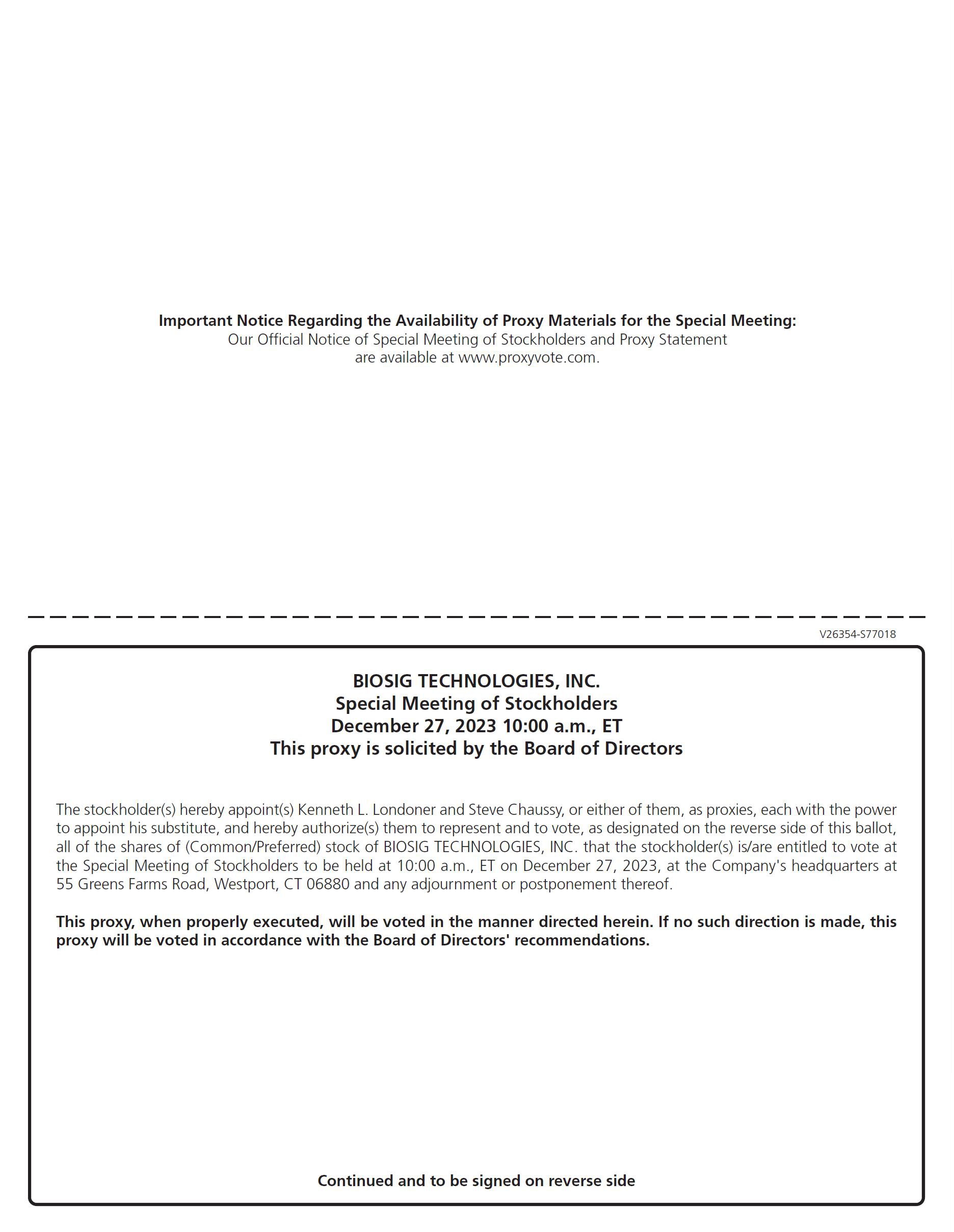 You are cordially invited to attend a special meeting of stockholders of BioSig Technologies, Inc. (the “Special Meeting”) to be held at 10:00 a.m., Eastern Time, on December 27, 2023, at our headquarters located at 55 Greens Farms Road, 1st Floor, Westport, Connecticut 06880.