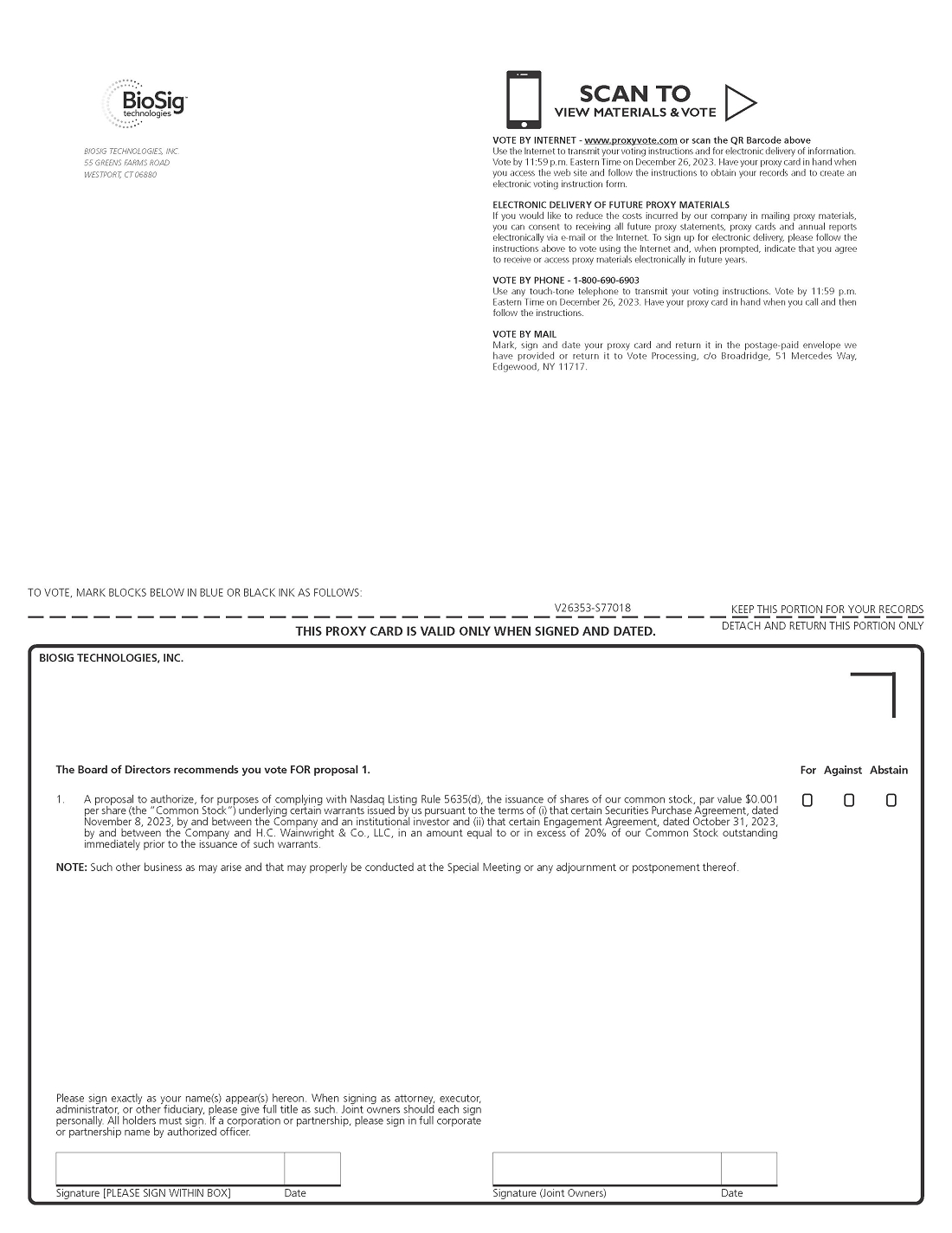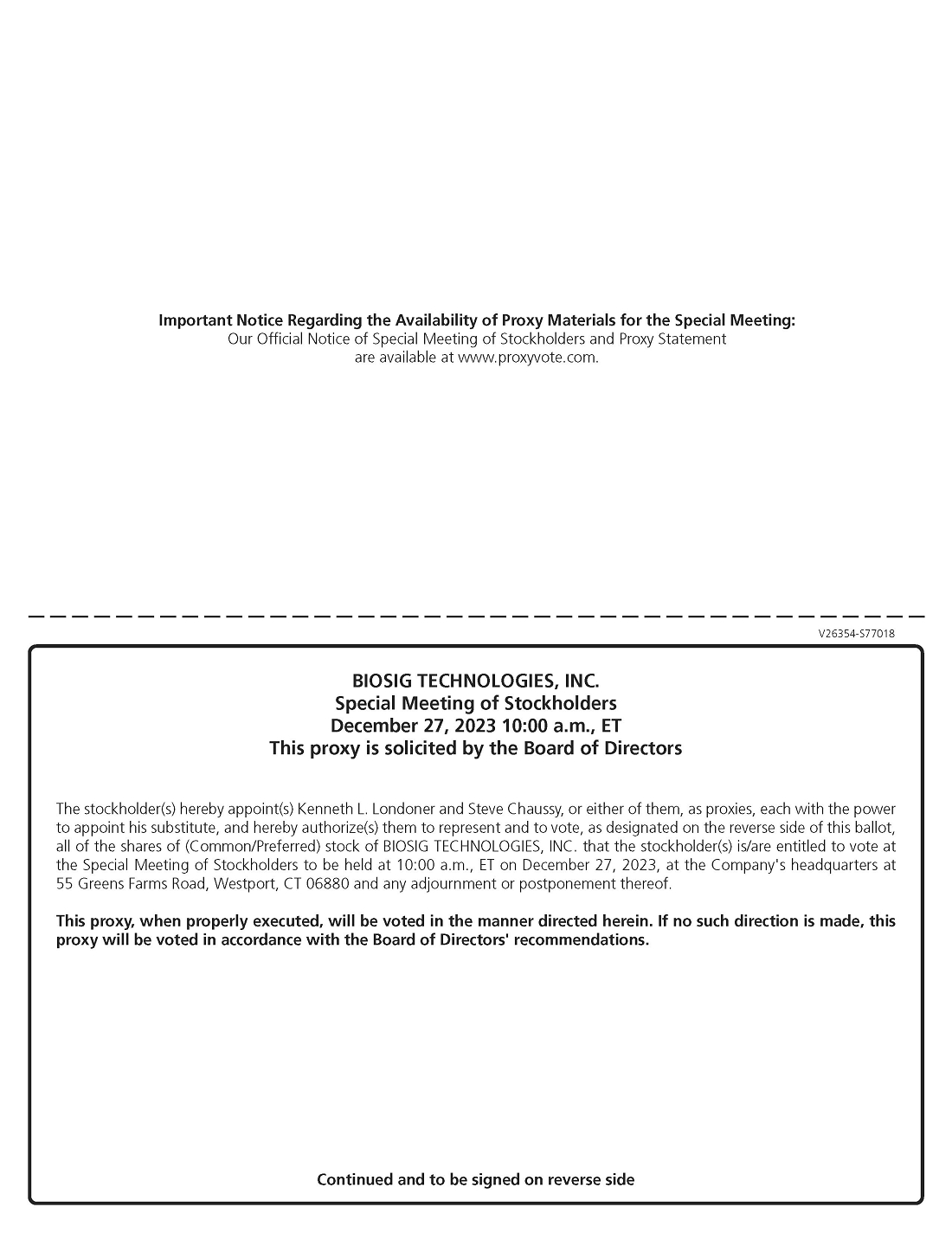 You are cordially invited to attend a special meeting of stockholders of BioSig Technologies, Inc. (the “Special Meeting”) to be held at 10:00 a.m., Eastern Time, on December 27, 2023, at our headquarters located at 55 Greens Farms Road, 1st Floor, Westport, Connecticut 06880.